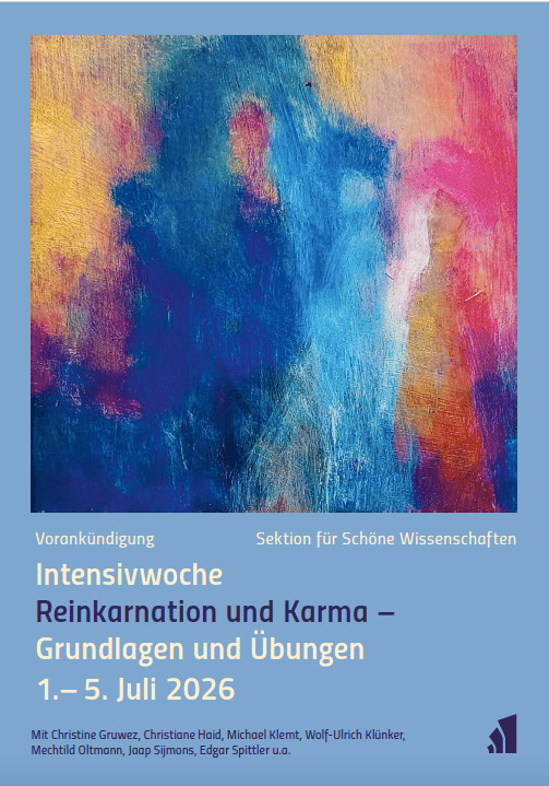Zu diesem weiten Blick können wir durch die Karmaübungen kommen, indem wir lernen, uns von dem Alltagsmenschen zu lösen und zu einer übergeordneten Form des Erlebens zu kommen. Nicht wer ich im früheren Leben gewesen bin, steht dabei im Vordergrund. Entscheidend ist, wie ich meinen Schicksalsumkreis erkennen und die in ihm liegenden Aufgaben zur Entwicklung von Mensch, Erde und Kosmos verwirklichen kann. Hiermit sind hohe Ideale formuliert, denen wir uns in dieser Intensivwoche von verschiedenen Seiten in Vorträgen, Gesprächsgruppen und künstlerischen Übungen annähern wollen.